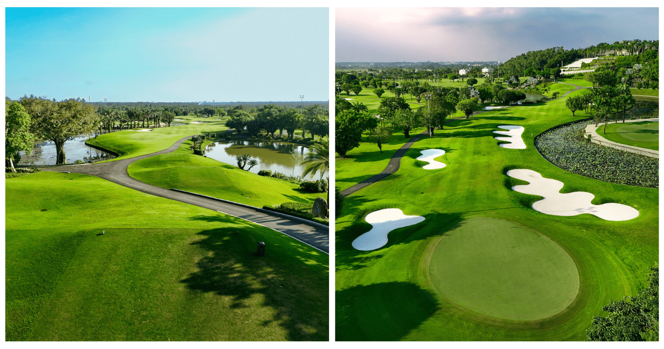 350헥타르의 광활한 부지에 힐 코스와 레이크 코스 두 개의 18홀 코스가 있어요. 힐 코스는 고원 지대에 건설되어 있어서 파노라마 뷰가 정말 환상적이에요. 롤링 페어웨이와 큰 그린이 특징이고, 야자수가 줄지어 늘어선 모습이 아름다워요. 레이크 코스는 거의 모든 홀에 워터 해저드가 있어서 전략적인 플레이가 필요해요. 두 코스 모두 Paspalum 잔디 페어웨이와 Tifdwarf Bermuda 그린을 사용하고 있어서 컨디션이 정말 좋아요. 레이크 코스는 야간 조명이 있어서 밤에도 라운딩할 수 있어요. 클럽하우스는 호찌민에서 가장 고급스러운 시설을 갖추고 있어요.